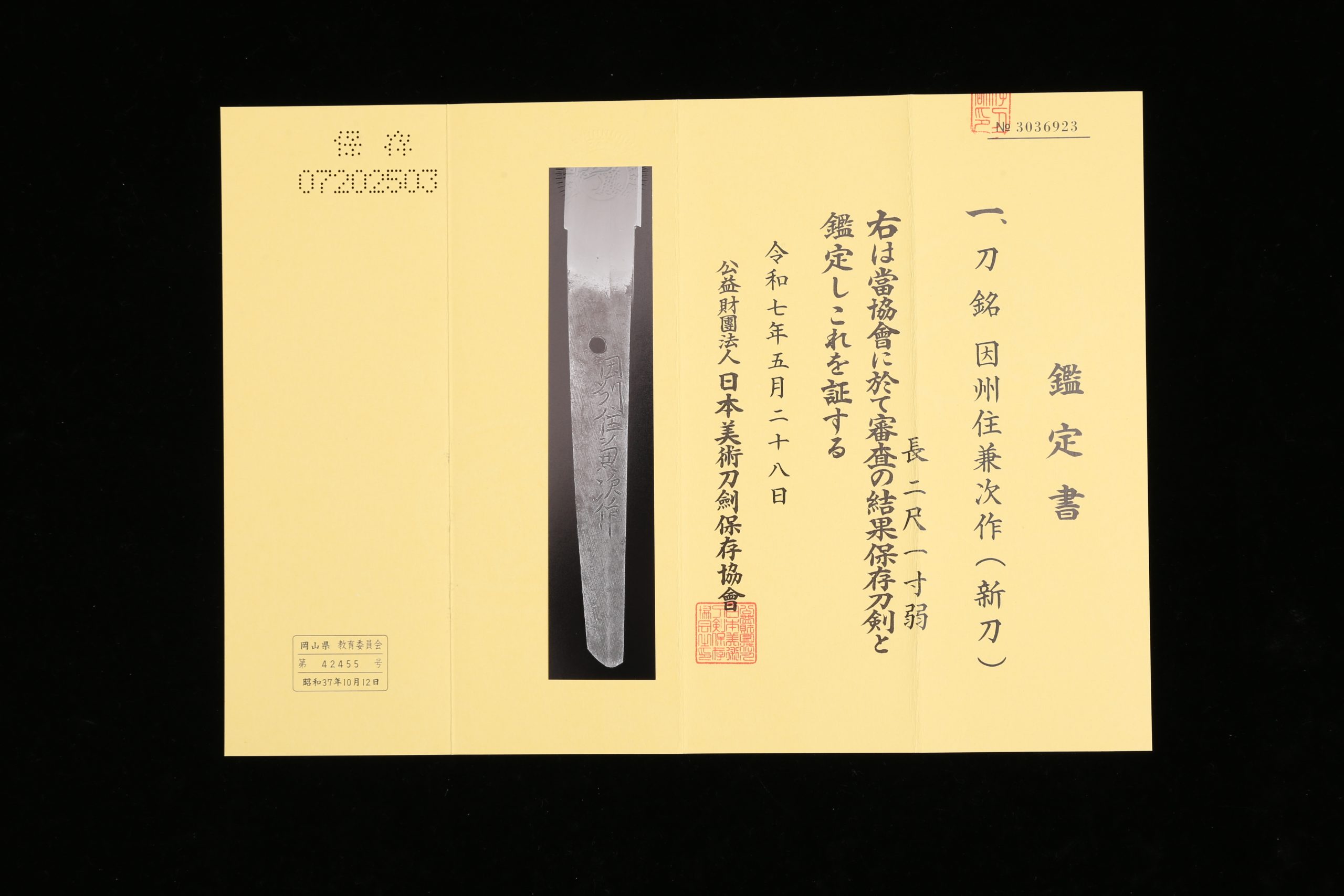 铭:因州兼次 编号:25249 作品年代:江戶初时期(距今约400年) 证书:日本美术刀剑保存协会保存证书 刃长:63.5cm 元幅:29mm 元重:6.4mm 先幅:20mm 先重:3.5mm
