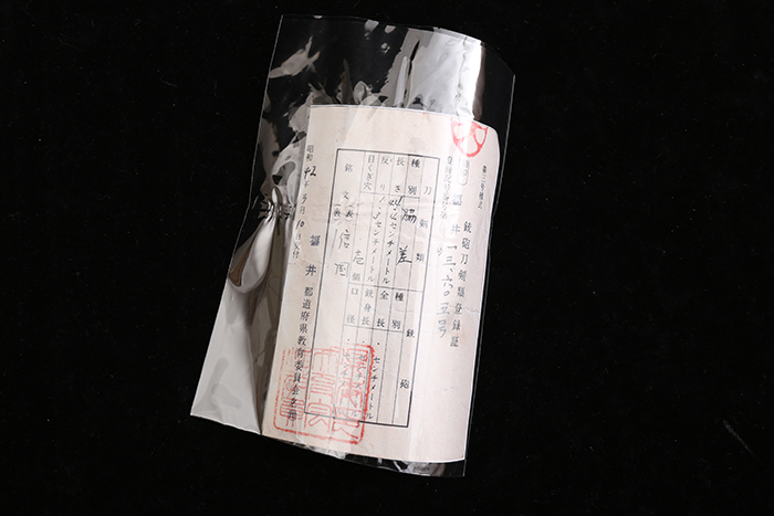 铭:信国 编号:25270 作品年代:江户时期(距今约300年左右) 证书:日本统炮刀剑登陆证 刃长:44cm 元幅:27mm 先幅:21mm 元重:5.85mm 先重:3.5mm