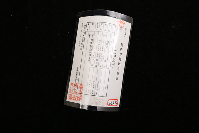 銘 越后国府内住兼门 编号:25320 刃长:53.2cm 元幅:29mm 元重:6.2mm 先幅:21mm 先重:3.4mm 作品年代:室町时代 证书:日本统炮刀剑登陆证