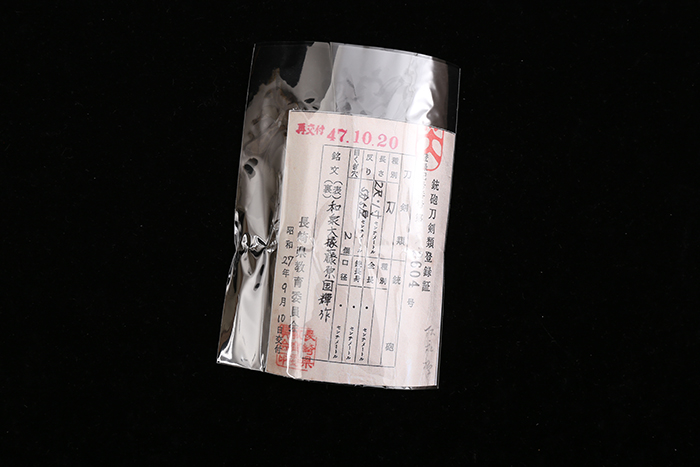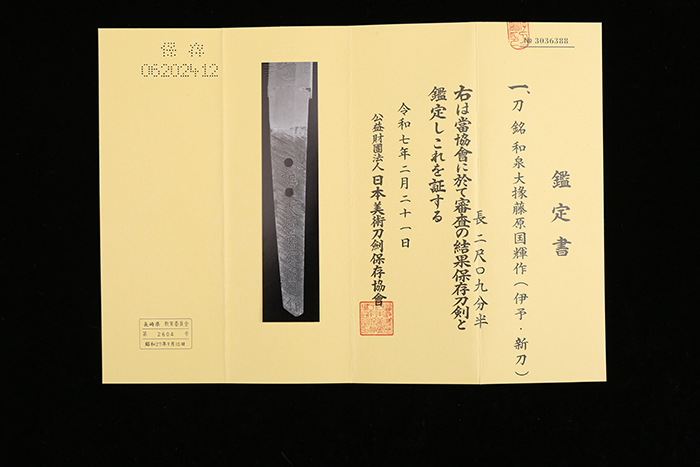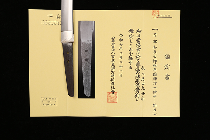 铭:和泉大掾藤原国辉 编号:25330 作品年代:江户1661年左右(距今约360年) 证书:日本美术刀剑保存协会 保存证书 刃长:63.5cm 元幅:31mm 先幅:23mm 元重:6.8mm 先重:3.7mm