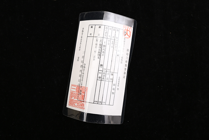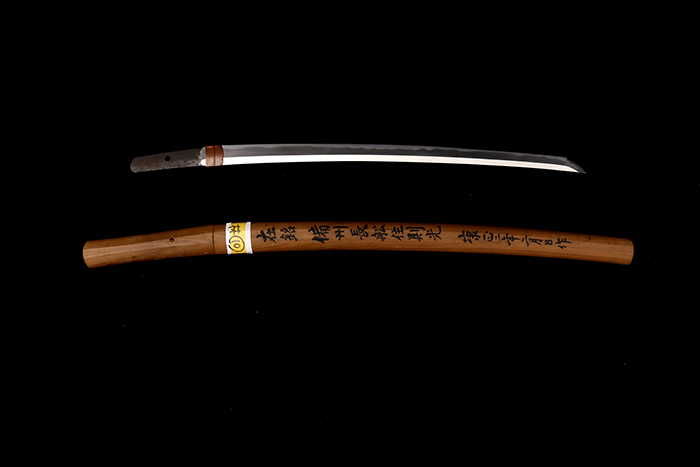 銘 备州长船则光 康正二年二月日 编号:26024 刃长:46.4cm 元幅:27mm 元重:5.6mm 先幅:19mm 先重:2.6mm 年代:康正二年二月对应公元 1456 年(丙子年)距今 570年