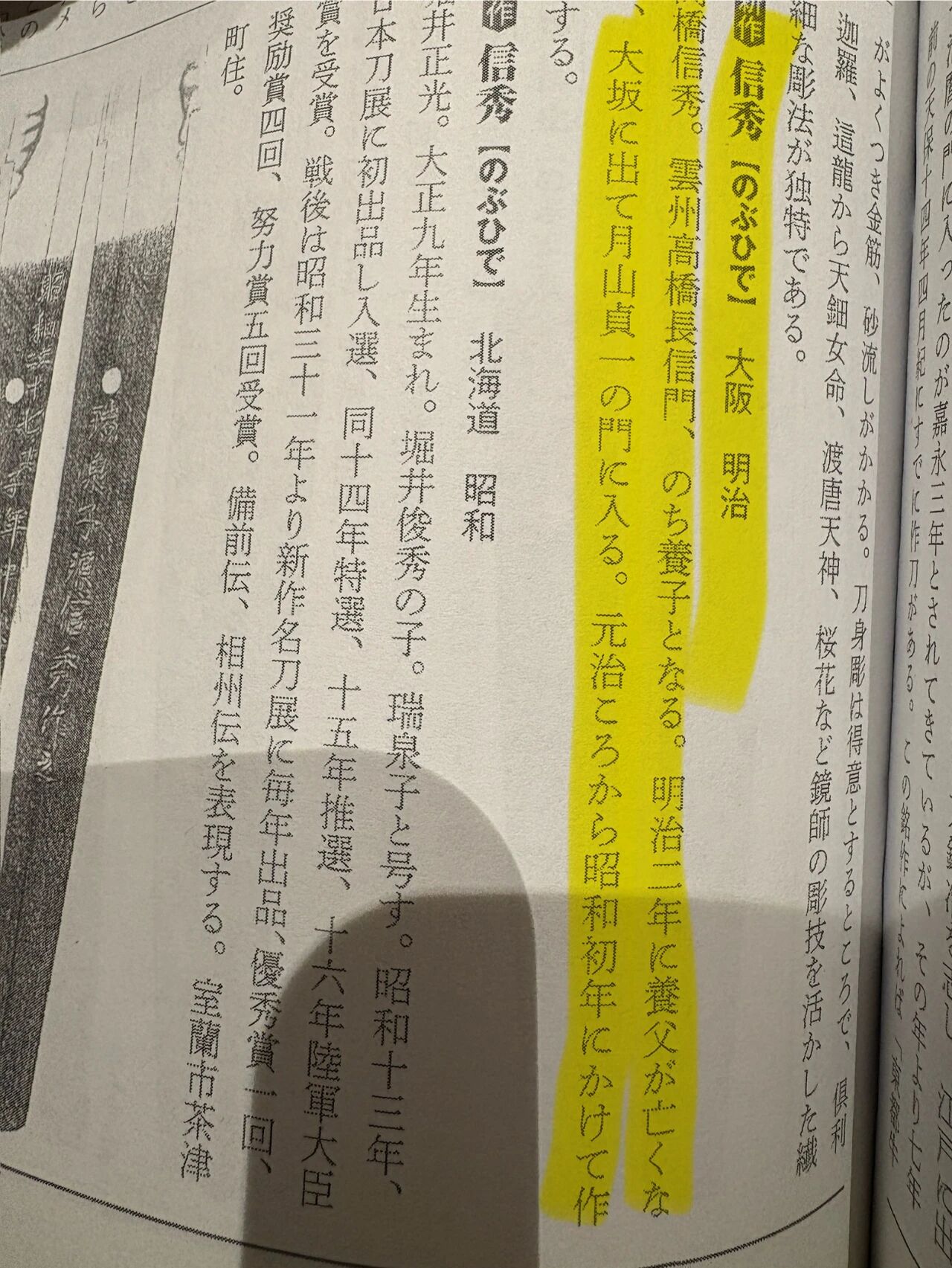 高桥信秀原本在出云,后来成为高桥长信的养子,学习相州传、长运齐纲俊和