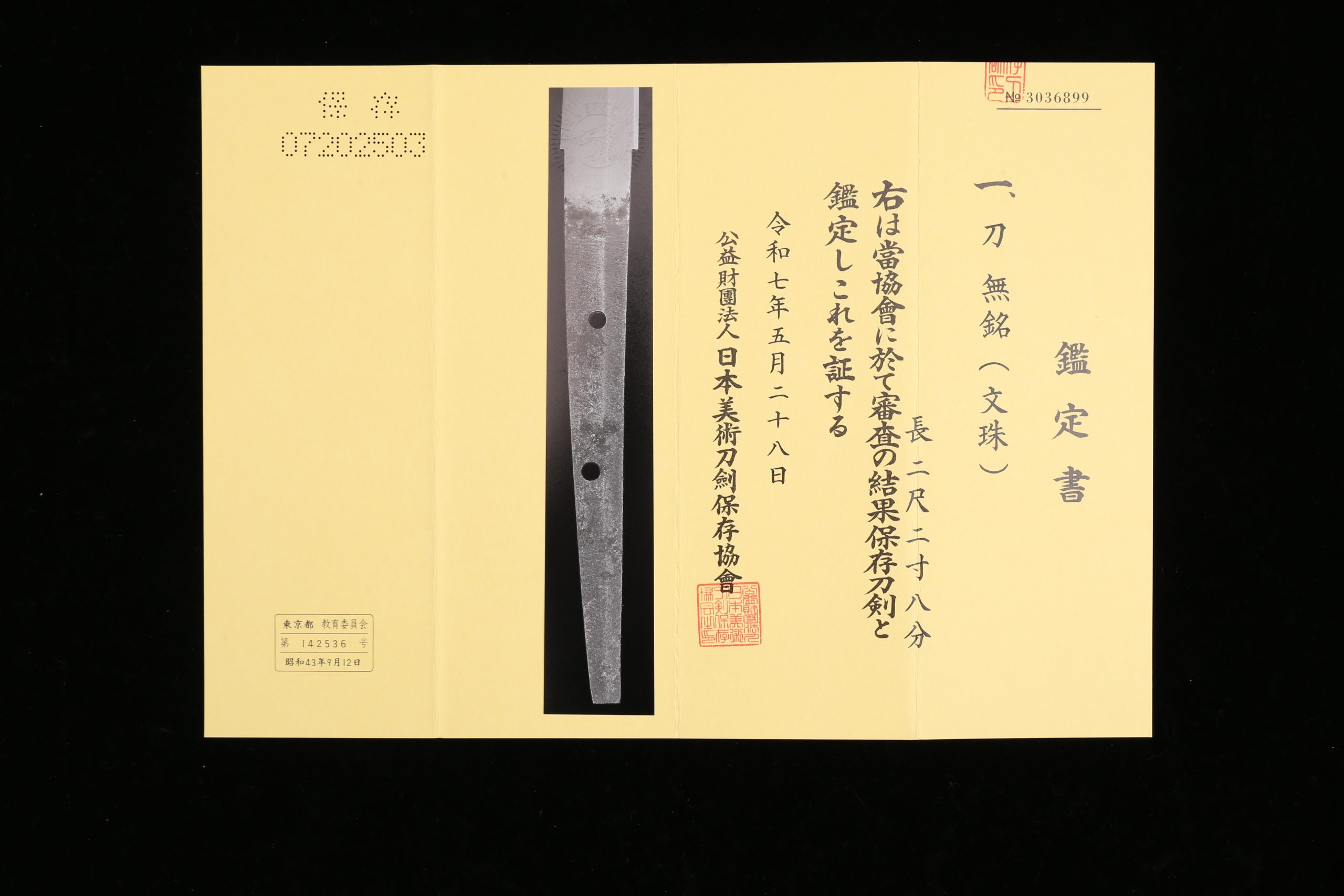 铭:無銘 (文珠) 编号:25250 作品年代:江戶时期(距今约400年) 证书:日本美术刀剑保存协会保存证书 刃长:69cm 元幅:29mm 元重:6.8mm 先幅:20mm 先重:4.2mm 文珠是指活跃于江户初期的纪伊文珠重国等人。 本国在大和,风格也沿袭大和传。 其中初代的南紀重国为德川家康锻刀。