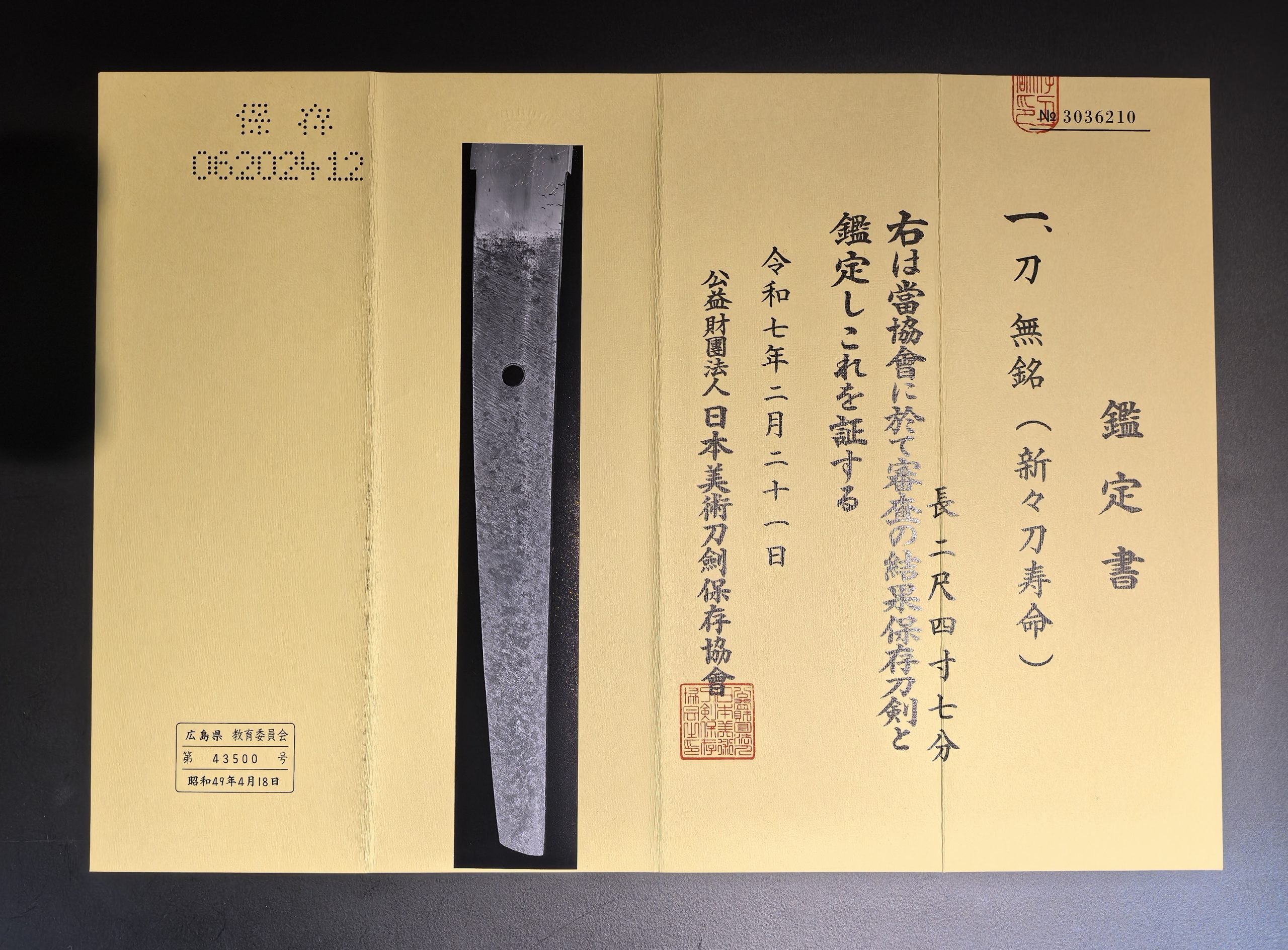 证书:日本美术刀剑保存协会 保存证书 (鉴定已合格,通知书已获得,5月初可以下发证书)