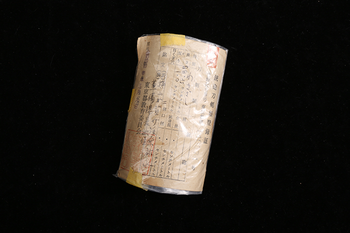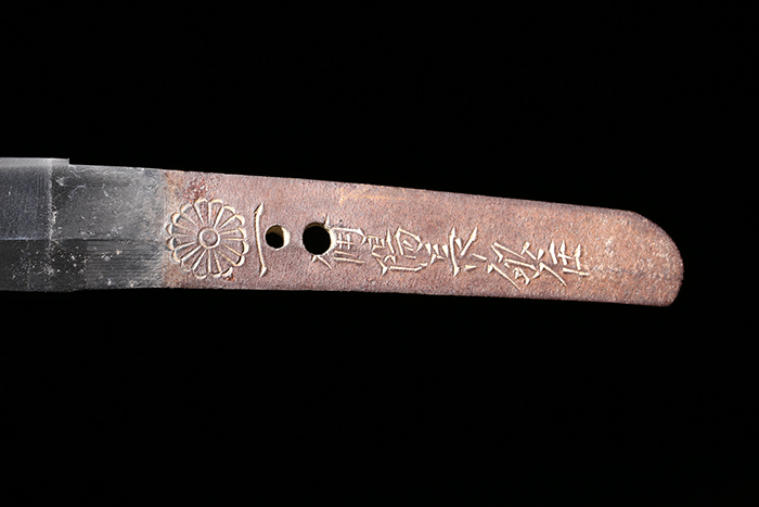 铭:橫山加賀介藤原祐永 (菊纹) 一 備前長船士 编号:26029 作品年代:江户後期(距今约300年) 证书:日本统炮刀剑登陆证 刃长:44.6cm 元幅:29mm 先幅:20mm 元重:7mm 先重:4mm