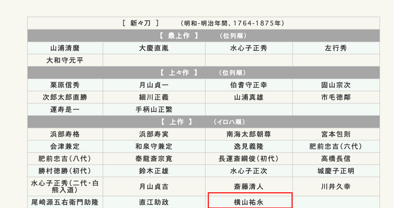 新刀期的横山一派在备前国长船之地繁荣,经过新新刀期一直延续到明治的废刀令。