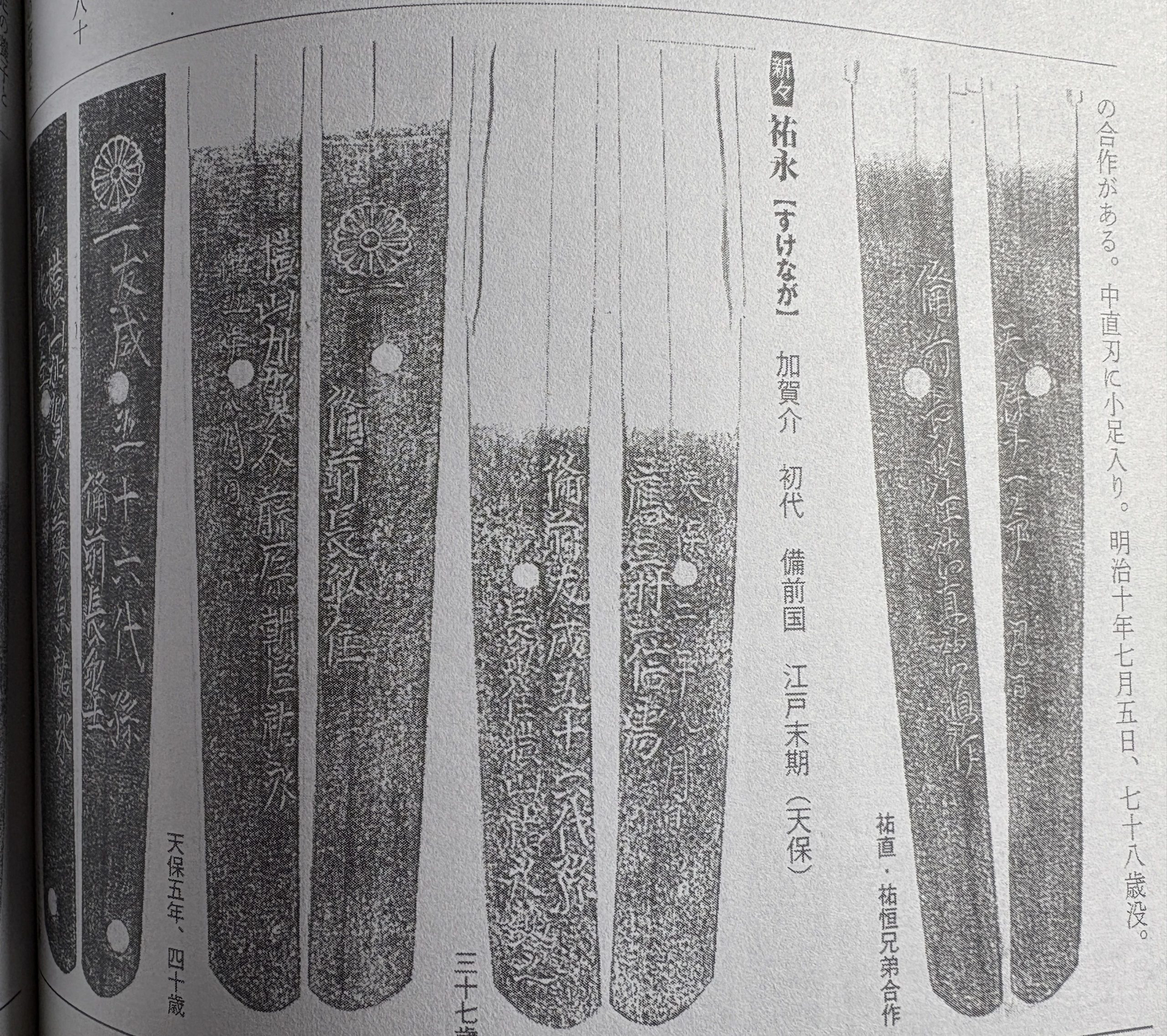 加贺介祐永是横山祐平的次子,因为哥哥祐盛成为七兵卫祐定的养子,所以继承了家 业。之后,天保四年接受加贺介,允许在茎上割出菊纹和一字,称为友成第五十六代孙, 留下了天保、弘化时期最为成熟的作品。风格上,小板眼皮肤细密的精美锻造,被称为祐 永丁子的香气的华丽丁子散乱最为拿手。新刀期的横山一派在备前国长船之地繁荣,经过新新刀期一直延续到明治的废刀令。 第一代佑永号“友成五十六代孙”,嘉永4年去世,享年57岁。弘化4年左右,初代去世, 二代祐永活跃。