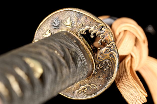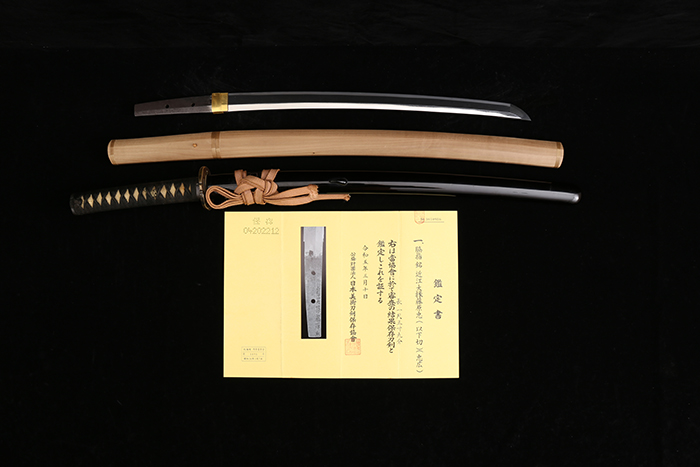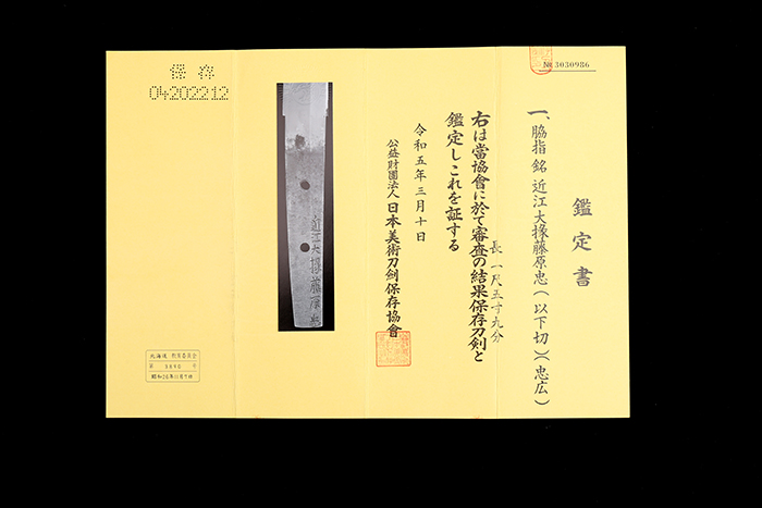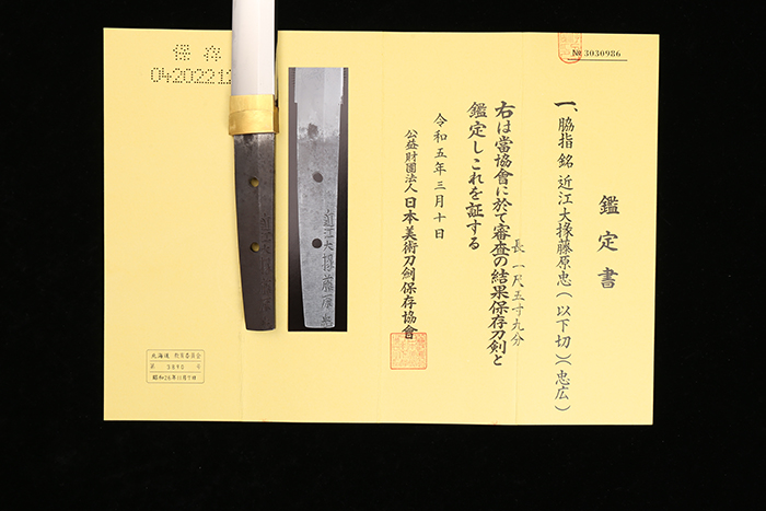 銘 肥前国住近江大掾藤原忠(広) 编号:25305W 刃长:48.5cm 元幅:31.5mm 元重:6.35mm 先幅:23.8mm 先重:4.6mm 年代:江户时期 证书:日本美术刀剑保存协会 保存刀剑证书
