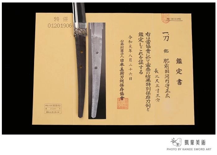 初代正广之子,生于宽永4年,原名桥本弥七郎,后称佐伝郎,初铭正永。万 治3年10月19日,其34岁时受领武藏大掾,宽文元年9月28日转任武藏守,宽文5年4月 13日受领河内守。初代正广在宽文5年2月5日逝世之后,二代在宣任河内守的同时袭 名正广。元禄12年8月6日逝世,享年73岁。作品风格为气口深直刃、互目乱、大互目 乱,与其他的肥前刀有所区别。刃文犹如夏天的积雨云一样,极富趣味。![]()